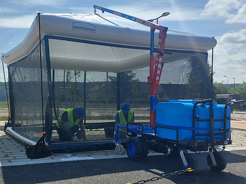 Dotée d’un toit gonflable et de 4 murs en PVC ajouré, la tente mobile PARINTEMPERIX permet de mener des travaux sous forte chaleur tout en assurant une bulle de confort à l’équipe, notamment grâce à un brumisateur (en option).